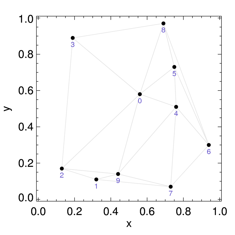 If the depth of a triangle is defined as the number of neighbor hops from the initial OEL, it has been shown that this algorithm performs a breadth-first search of the Delaunay graph. So, all triangles will be discovered in a finite number of iterations of step (4). In practice this value is likely to be between 5-10. We implement step (4) as a series of CUDA kernels which are then typically run for a small number of iterations until the OEL is empty and the triangulation is complete. The TL is then transfered back to the host and either (a) visualized (in the case of our project example code); or (b) used to construct the voronoi polyhedra for the hydrodynamics simulation (in the case of the the application usage scenario).