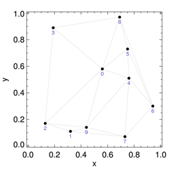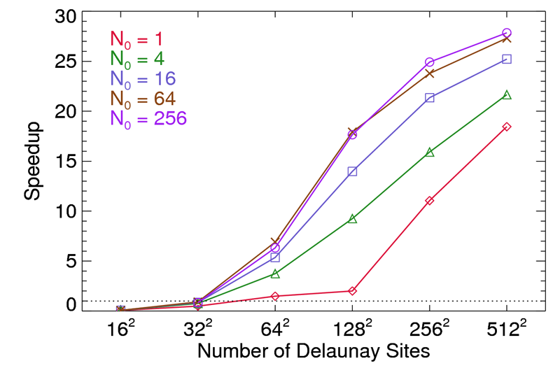 An important source of parallelism in this algorithm is its ability to start from multiple (or all) points simultaneously. Figure 3 shows the same speedup measures at for various numbers of starting points N0 from one to 256. For point sets N > 642 performance monotonically increases with increasing numbers of starting sites. Starting with 162 sites the gain is marginal, which may be indicative of some component not scaling as well as it should. Similarly, for large N0 the speedup appears to be approaching an asymptotic value with increasing point set size. In contrast, starting with only one or four sites seems to avoid this behavoir.