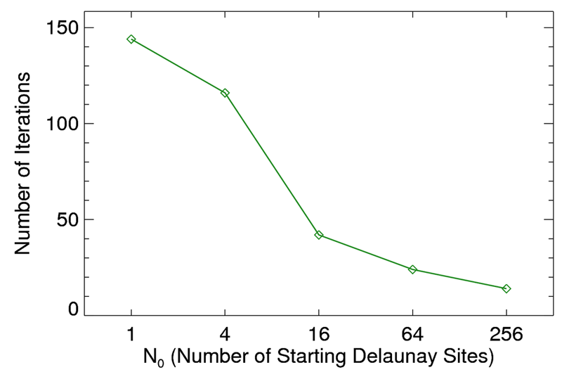 The main consequence of the number of starting points is a reduction in the number of open edge expansion iterations. We measure this drop at fixed point set size 1282 in Figure 4. We expect that in the limit of N0 -> N, the number of iterations will approach our best case scenario of 5 - 10, and this does appear to be the case. It will be informative to further explore the case when N0 = N. This mode generates extremely large open edge lists, which although in theory allow the most parallelization potential, may be subject to bottlenecks in our code.