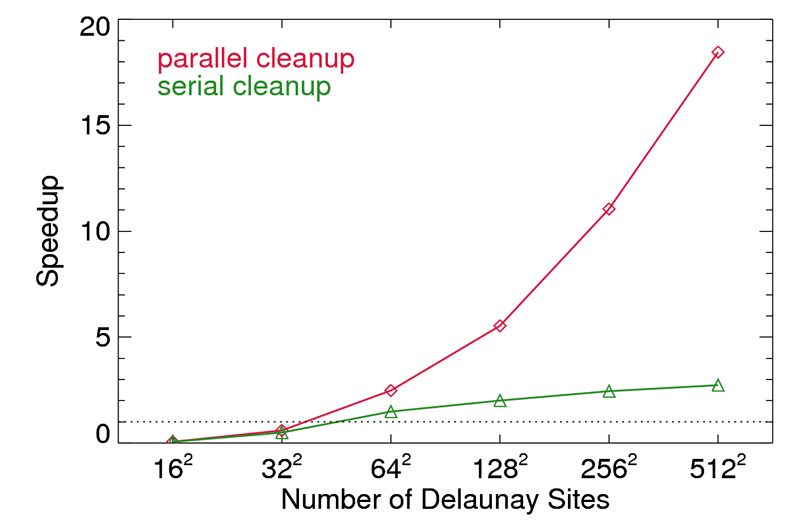 First, Figure 2 presents the speedup of the GPU accelerated algorithm relative to our otherwise identical serial implementation on the CPU. In the case where the "cleanup" phase remains on the CPU (our first attempt), additional memory transfer overhead and CPU-based array duplicate removal and compaction leads to an asymptotic speedup of a few. Rewriting the majority of the cleanup as a GPU kernel (although we leave the OEL compaction on the host for now) allows us to skip unnecessary memory transfers and perform the duplicate checks more quickly. In this case we reach large speedups of > 10 as the point set size grows larger. However, the strong caveat is that we are comparing our highly unoptimal serial implementation to our GPU method. State of the art serial tesellators optimized for the CPU will not only greatly outperform our implementation by large margins, they will also scale better with the point set size. Thus, our measured speedup is more an indication of the parallelization potential of the "incremental construction" approach to Delaunay triangulation, rather than an indication of real world performance.