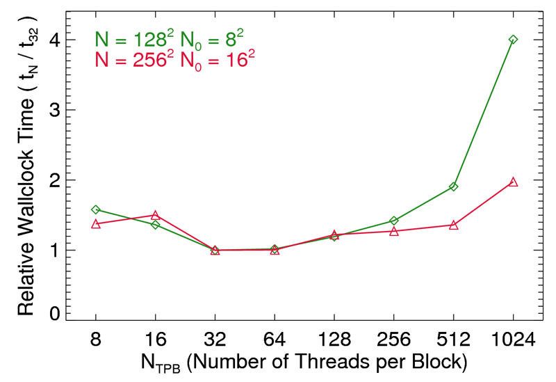 Figure 5. Relative increase in run (wallclock) time as a function of the number of threads assigned per block. Each is normalized to our nominal testing value of 32, which we in fact find to be the optimal configuration.